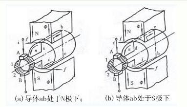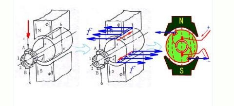 如上圖(a)所示,則有直流電流從電刷A流入,經過線圈abcd,從電刷B流出,根據電磁力定律,載流導體ab和cd收到電磁力的作用,其方向可由左手定則判定,兩段導體受到的力形成了一個轉矩,使得轉子逆時針轉動。如果轉子轉到如上圖(b)所示的位置,電刷A和換向片2接觸,電刷B和換向片1接觸,直流電流從電刷A流入,在線圈中的流動方向是dcba,從電刷B流出。